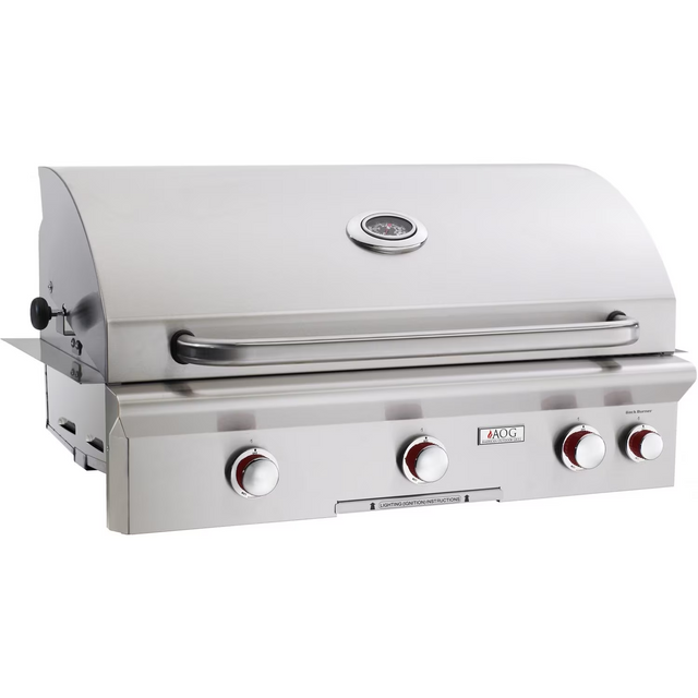 The Piezo Rapid Light ignition system ensures quick start-ups with no electricity or batteries required. Stainless steel vaporizer panels promote even heat distribution and minimize flare-ups, while solid brass valves with red-flared knobs provide precise temperature control. For added versatility, this model includes a 12,000 BTU rear infrared rotisserie burner—perfect for slow roasting poultry and roasts with professional results. A sleek satin-finish hood, seamless control panel, and custom analog thermometer complete the stylish design. With its combination of durability, functionality, and elegance, the AOG 36-Inch T-Series Built-In Gas Grill is the ultimate addition to any outdoor cooking space.