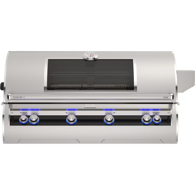 The Fire Magic Echelon E1060i is the ultimate luxury grill, designed for chefs who demand precision, power, and performance. Built with 304 stainless steel inside and out, this grill showcases unmatched craftsmanship and innovative engineering. Its modern black glass control panel, backlit knobs, and interior halogen lighting make it as stylish as it is functional. With 84,000 BTUs of cast stainless steel burners and a powerful 25,000 BTU infrared searing burner capable of reaching 1000°F, you can sear steaks to perfection, grill delicate seafood, or roast meats on the heavy-duty rotisserie. The patented Diamond Sear cooking grids ensure optimal heat transfer and even cooking results, while flavor grids and heat zone separators offer versatility for multiple cooking styles at once. A spring-assisted, double-walled hood, Magic View Window, and smooth-glide drip tray elevate ease of use and convenience. Proudly made in the USA, this grill is a centerpiece for any luxury outdoor kitchen.